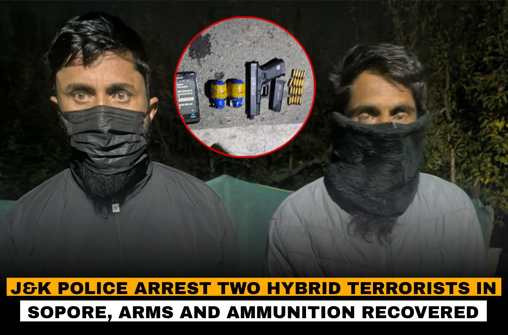 November 13: J&K Police in Sopore along with 22 RR and 179BN CRPF, arrested two hybrid terrorists during a joint naka operation at Sadeeq Colony, Mominabad Sopore. The naka was established following specific input regarding movement of suspicious individuals in the area.During checking, two persons coming from Fruit Mandi Sopore towards Ahat Baba Crossing attempted to flee on noticing the presence of police and security forces. The joint team acted promptly and apprehended both individuals on the spot.The arrested persons have been identified as Shabir Ahmad Najar son of Mohammad Akbar Najar resident of Mohalla Tawheed Colony Maazbugh and Shabir Ahmad Mir son of Mohammad Sultan Mir resident of Brath Sopore. Incriminating materials, arms & ammunition including 01 pistol, 01 magazine, 20 live rounds and 02 hand grenades were recovered from their possession. The recoveries indicate their involvement in terror-related activities in the area.In this regard, a case FIR No. 253/2025 under relevant sections of law has been registered at Police Station Sopore, and investigation has been set into motion. J&K Police reaffirm their commitment to maintaining peace and security across the valley.